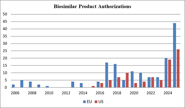 As illustrated in the following graph, the EU’s significant head start and higher approval rate led to an imbalance in the number of biosimilar drugs available in the respective markets, and this imbalance was amplified in the past year. In 2025 alone, the EMA authorized a record 44 biosimilars, far outpacing the 26 approvals granted by the FDA. However, in October 2025, the FDA released updated guidance for biosimilars that aims to reduce unnecessary clinical testing and accelerate biosimilar development, so it’s possible the FDA may keep pace with EMA approvals in the future.
